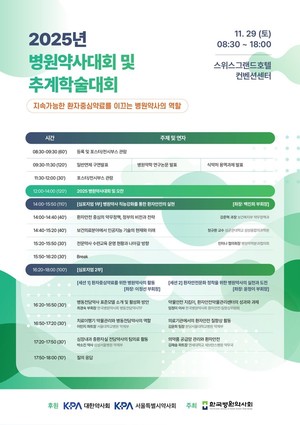 한국병원약사회(회장 정경주)는 오는 11월 29일(토) 스위스그랜드호텔 컨벤션센터에서 ‘지속가능한 환자중심약료를 이끄는 병원약사의 역할’을 주제로 2025년도 병원약사대회 및 추계학술대회를 개최한다.매년 11월 개최되는 병원약사대회 및 추계학술대회는 전국 병원약사들이 한자리에 모여 한 해 동안 갈고 닦은 학술적 역량과 연구결과를 공유하면서 회원간 친목과 화합을 도모하는 의미 깊은 축제의 현장이다.최근 의료환경은 고령화, 만성질환 증가, 의료기술의 고도화로 환자 개별 요구에 맞춘 환자중심의 약료가 필수 요소로 자리잡고 있고, 동시에