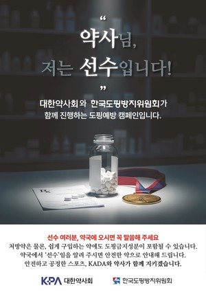 대한약사회(회장 권영희, 이하 약사회)가 한국도핑방지위원회(위원장 양윤준, 이하 KADA)와 도핑 예방을 위한 공동 캠페인을 전개한다.약사회는 오는 30일, 제10회 대한민국 약사학술제가 열리는 서울 코엑스에서 KADA와 도핑 예방을 위한 「약사님, 저는 선수입니다」 공동 캠페인(이하 캠페인) 추진을 위한 업무협약(MOU)을 체결할 예정이다.이번 캠페인은 스포츠 선수의 건강을 보호하고 공정한 경기 문화를 조성하기 위해 양 기관이 도핑 예방에 공동 대응하자는 취지로 마련됐다.특히 선수들이 약국에서 의약품을 조제·구입할 때 스스로 “저