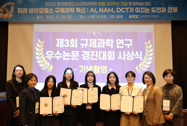 재단법인 한국규제과학센터(센터장 박인숙, 이하 센터)는 ‘제3회 규제과학 연구 우수논문 경진대회’ 시상식과 수상작 연구논문 발표를 11월 28일 서울가든호텔(서울 마포구 소재)에서 열린 ‘2025 KFDC 규제과학회 창립 20주년 기념 추계학술대회’ 특별 세션에서 개최했다.