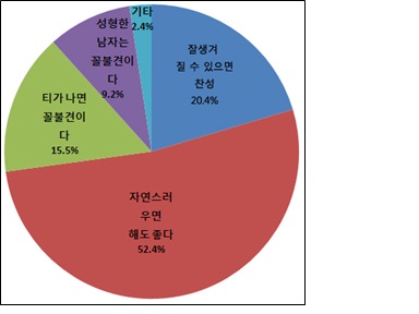 조사 결과 ‘잘생겨질 수 있으면 찬성’(20.4%), ‘티 안 나고 자연스럽다면 해도 좋다’(52.4%) 등 긍정적인 응답이 72.8%로 높은 비율을 차지한 반면 ‘성형한 남자는 꼴불견’(9.2%), ‘잘생겨져도 성형한 티가 나면 싫다’(15.5%) 등 부정적 반응은 24.8%, 기타, 무응답이 2.4%에 불과했다. 남자친구(애인)의 성형수술에 대해서도 찬성, 긍정적 응답이 71.8%, 반대가 28.2%로 비슷한 반응을 보였다.